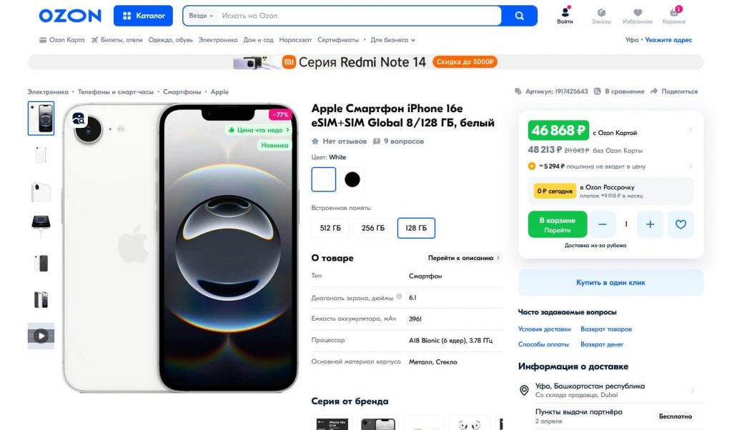 После запуска iPhone 16e многих шокировала его цена — от 599 долларов. Дороговато, с учетом того, что его предшественник iPhone SE 2022 стоил от 429 долларов, пусть и за версию с 64 Гб. В Россию он добрался уже с откровенно неадекватной ценой: торговые сети принимали предзаказ на новый Айфон от 78 000 рублей за модификацию со 128 Гб. Однако менее чем за две недели цена iPhone 16e сильно упала — теперь его легко найти за 47 000 рублей! Для сравнения: новый iPhone SE 3 сейчас стоит в районе 43 000 рублей, причем с 64 Гб памяти.