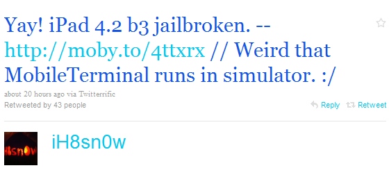 Со страниц twitter-аккаунта одного из хакеров iOS, автора таких программ как Sn0wbreeze, iREB, f0recast, известного под ником iH8sn0w, слетела первая ласточка о джейлбрейке iPad на iOS 4.2. А именно, iH8sn0w добавил в свой twitter фотографию взломанного iPad, на котором установлена последняя beta прошивки 4.2, которая в свою очередь еще даже не вышла в массы.