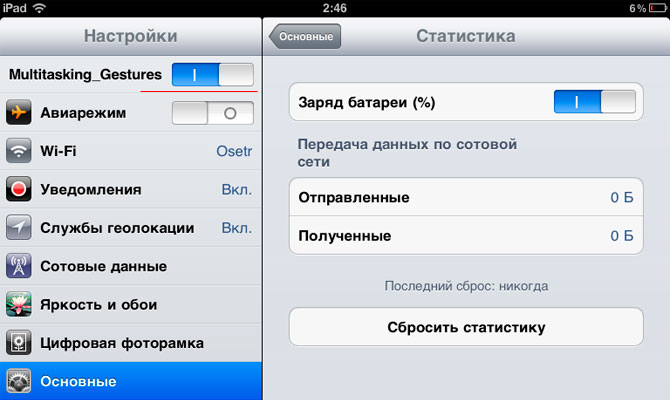 После замены файлов необходимо перезагрузить iPad. Теперь отключение и включение Multitasking Gestures доступно в меню «Настройки».