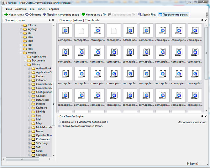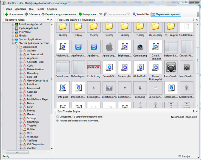 Инструкция: Для того, чтобы активировать мультитач — жесты на iPad нам понадобится доступ к файловой системе, а как известно — iOS закрытая операционная система. Получить доступ к файлам мы можем сделав джейлбрейк. Как сделать непривязанный джейлбрейк iOS 4.3.1 смотреть здесь. Далее нам понадобится файловый менеджер для iOS устройств, какой будете использовать вы решайте сами, в инструкции я буду использовать iFonBox для Windows. Скачать последнюю русскую версию можно здесь. Теперь необходимо заменить файлы в вашем iPad, на файлы из архива: Скачать архив. В архиве три файла: com.apple.springboard.plist General.plist Settings.plist Подключаете iPad к компьютеру, открываете iFoneBox нажимаете «Чистая файловая система» (Raw File System) и закачиваете файл com.apple.springboard.plist по адресу /var/mobile/Library/Preferences.