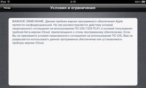 Третью бета-версию iTunes 10.5 невозможно передать «по воздуху», то есть через Wi Fi – в этом плане ожидание не оправдалось. Чтобы получить обновление, придется скачать iOS 5 beta 3, а затем установить проверенным, хотя и старым способом – используя data-кабель. После первой загрузки стартовый экран будет иметь несколько непривычный для вас вид, напоминающий вам о необходимости использования конфиденциального программного обеспечения Apple. Можно будет сразу же включить/отключить службы геолокации. Либо это можно будет сделать и позже, зайдя в Настройки.