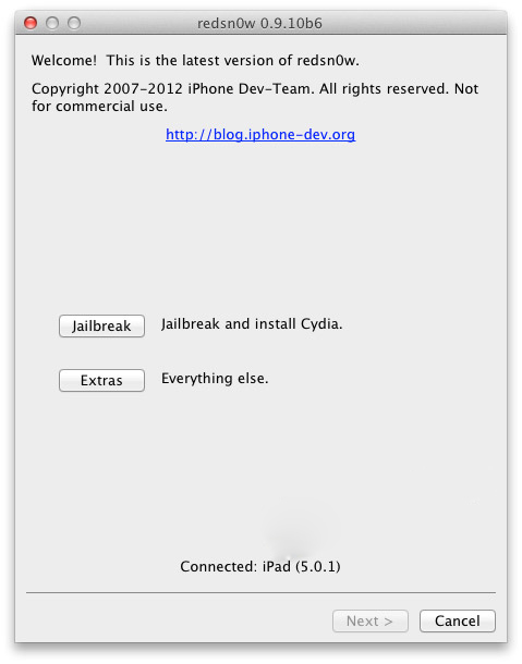 1. Теперь, если вам нужно будет перезагрузить iPad (iPhone), нужно будет подключать его к ПК и переводить в режим джеилбрейка iOS 5.1 с помощью Redsn0w 0.9.10b6.