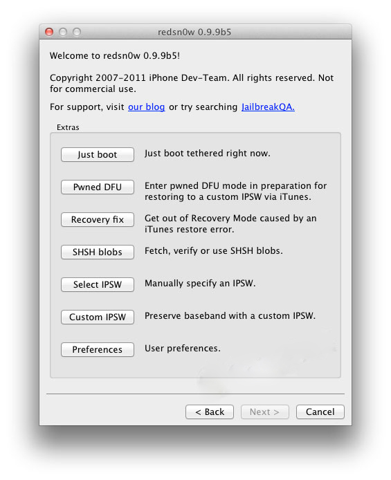 2. Запускаем Redsn0w 0.9.10b6 и нажимем Extras, затем нажимаем Just boot.
