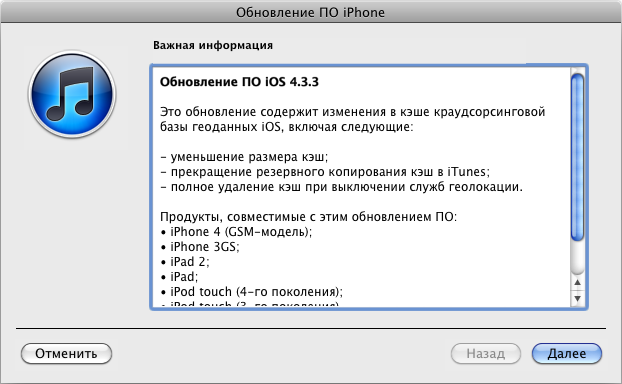 Наконец-то закончился скандал о слежке компании Apple за пользователями ее устройств. Очередное обновление iOS 4.3.3 фактически является элементарной заплаткой, предназначение которой закрыть наделавшую столько шума дырку, определяющую местоположение обладателей i-гаджетов. Новая прошивка не имеет принципиальных отличий от предыдущей — iOS 4.3.2.