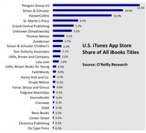 Лорика подчеркивает тот факт, что количество наименований книг, представленных в iBooks, на данном этапе приходится считать ограниченным. Соответственно, и в список издателей, чья продукция представлена наиболее широко, попали преимущественно те, с которыми компания Apple успела заключить договоры о сотрудничестве до поступления iPad в продажу. На протяжении следующих нескольких месяцев список очевидно будет подвержен изменениям. Пока же три лидерских места вполне ожидаемо «оккупируют» гиганты Penguin Books US (23,5%), Simon & Shouster (19%) и Harper Collins (15,9%).