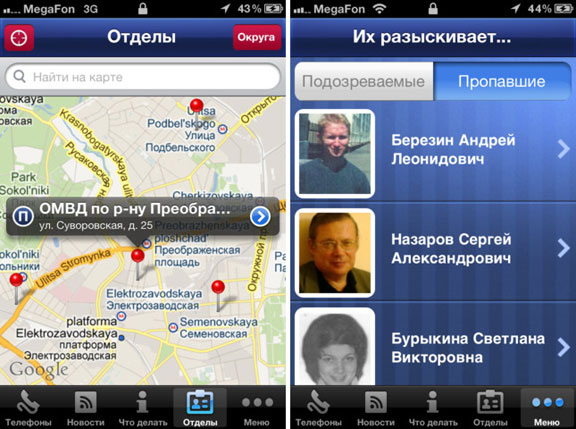 Благодаря новому приложению для iOS, каждый сможет получить последние новости столичной полиции. Вот пример разделов, которые можно найти в Меню Московской полиции: «Экстренные телефоны», тут выставлены основные номера экстренных служб Москвы, «Новости и события», контент данного раздела дублирует информацию официального сайта главка; раздел «Отделы», содержит адреса отделений полиции, МОГТОРЭР, участкового уполномоченного, и последний раздел, «Их разыскивают», содержащий сведения о гражданах, разыскиваемых за преступления или пропавших без вести.