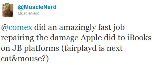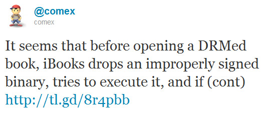 «Перевод: @comex на удивление быстро нашел способ обойти защиту Apple в iBooks на любой платформе с джейлбрейком.»