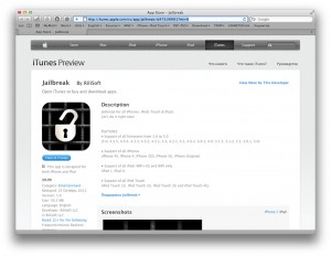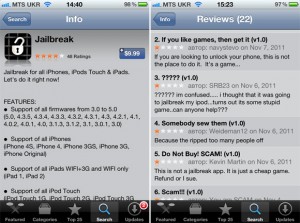 Каково же было удивление почитателей яблочной техники, когда пару дней назад в популярном онлайн магазине программного обеспечения App Store появилось приложение jailbreak, сопровождавшееся классической эмблемой джейлбрейка, столь знакомой потребителю. Программе сопутствовало описание, гласившее о том, что с ее помощью вы быстро и легко сможете осуществить «взлом» любого устройства на основе iOS всех версий. Это и стало первым фактом, который насторожил пользователей (тем не менее, не помешав им скачать бесполезное ПО по довольно высокой цене). Напомним, что настоящие программы для проведения джейлбрейка довольно узкоспециализированные, бесплатны, поставляются отдельно под каждую новую вышедшую версию операционной системы и устройства от Apple. К тому же, неизвестный Jailbreak обещал работу с последней моделью iPhone 4S, по поводу успехов взлома которого пока молчат даже самые известные команды, занимающиеся разработкой соответствующих приложений.