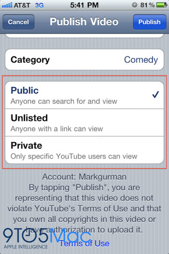 Так же из новшеств можно отметить возможность с iPhone 4 при публикации на YouTube устанавливать права.