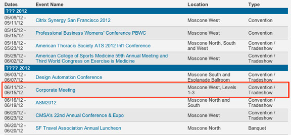 На сайте выставочного центра Moscone Centre появилась информация о будущих мероприятиях. Конференция WWDC ’12 назначена на 11-15 Июня 2012 года. WWDC — это всемирная конференция Apple, которая проходит каждый год. На этом мероприятии Apple презентует новый iPhone и обновленную iOS и другое программное обеспечение. В прошлом году конференция была посвящена iOS 5, сервису iCloud и Mac OS X Lion. В этом году ожидается выход новой iOS 6 и конечно же iPhone 5.