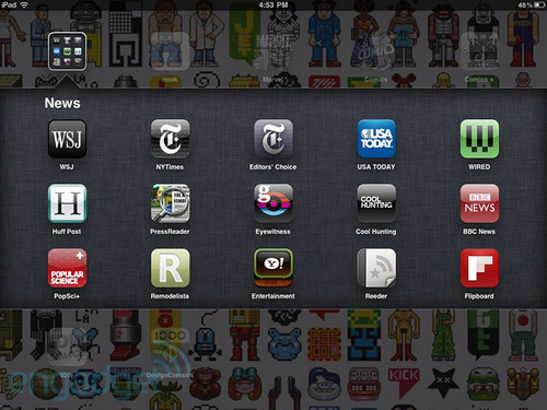 Папки (Folders), — это возможность организации и группировки приложений каталогами. Работает следующим образом — при перетаскивании одной иконки на другую на рабочем столе iPad система iOS 4.2 автоматически создает папку. Что позволит пользователям iPad сэкономить пространство на рабочем столе и с легкостью сортировать свои загрузки из магазина App Store. Тем не менее, в отличие от iPhone, большой экран iPad позволяет размещать в одной папке максимальное количество приложений, равняющееся не 12, а 20.