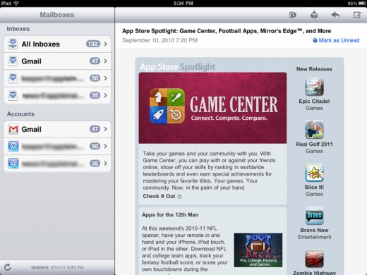 Изменилось приложение Mail, в iOS 4.2 для iPad Mail получило универсальный почтовый ящик и возможность (через вкладку предпочтений Mail) организовывать письма в единую ветку. Как и на iPhone и iPod touch, входящие сообщения автоматически объединяются в одну ветвь, что позволяет экономить пространство и делает работу приложения Mail более эффективной.