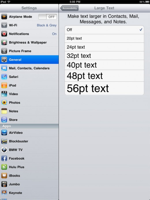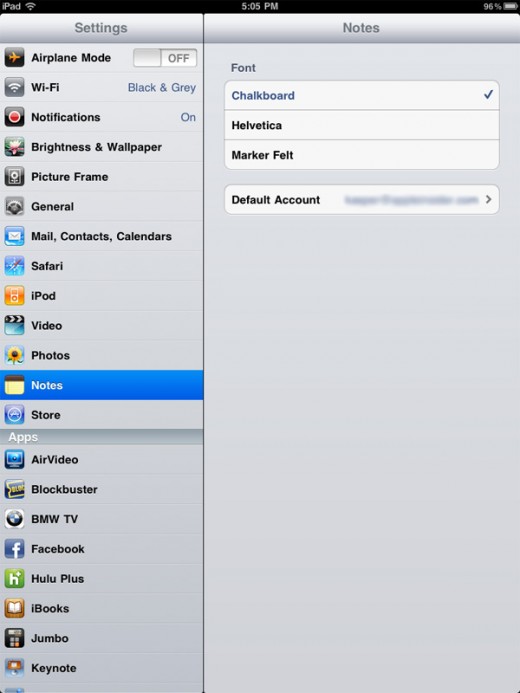 В новой версии iOS Apple добавила вкладку Предпочтения заметок, где пользователи имеют возможность выбора шрифта для своих заметок. Правда, для того, чтобы изменить шрифт пользователю придется заглянуть в системные настройки iPad. На данный момент предложено три шрифта – Chalkboard, Helvetica и Marker Felt. Кроме того, здесь пользователи также могут выбрать почтовый аккаунт, который по умолчанию будет привязан к заметкам.