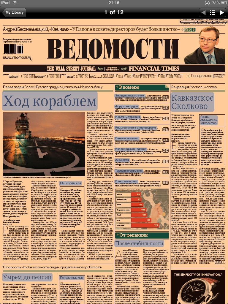 Интересно, то что газету можно не только читать, но и прослущать ее аудио версию прикоснувшись к заголовку, правда «диктор» и его дикция оставляет желать лучшего, но я думаю это дело времени. Полный обзор напишу в ближайшее время.