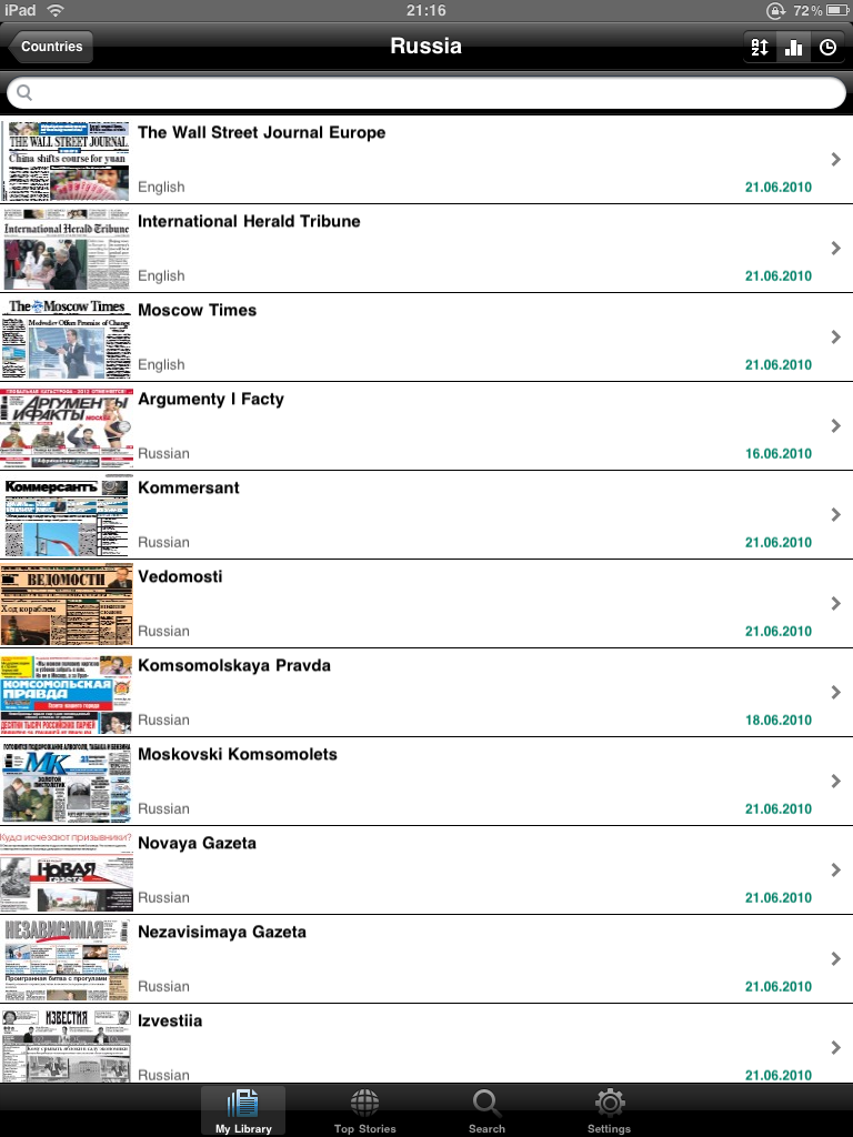 В связи с тем, что в Россию завезено около 80000 iPad, наши СМИ решили начинать переходить в электронные версии, ура. Теперь счастливые обладатели iPad могут читать русские издания. Для этого нужно скачать из AppStore бесплатную программу PressReader выбирать нашу страну и Вам станут доступны 55 различных русских газет такие как Ведомости, КоммерсантЪ, КП...